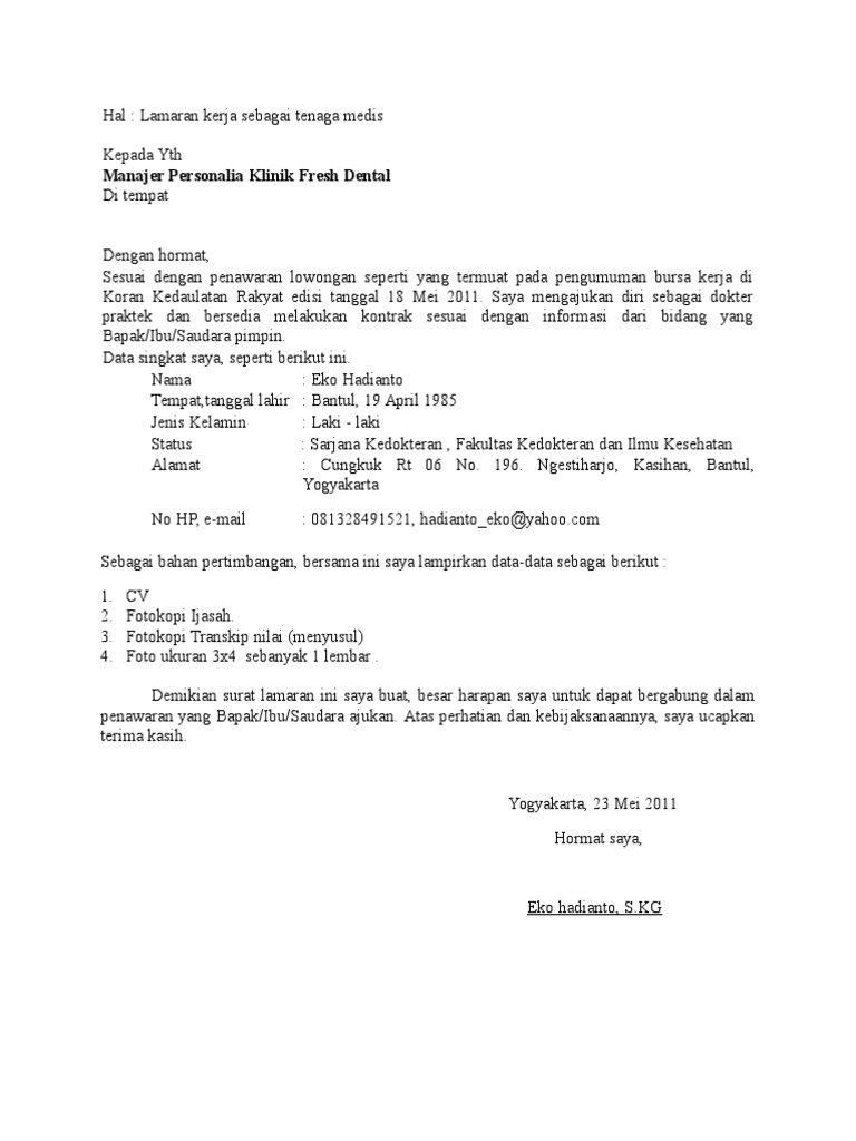 Contoh surat lamaran kerja perawat di puskesmas. Bermaksud untuk mengajukan lamaran pekerjaan di klinik sehat semua jakarta barat sebagai tenaga medis bidan. Dalam pembuatan surat lamaran kerja di pt anda harus menulis posisi yang sesuai dengan yang dibutuhkan pt tersebut. Bukan hanya surat lamaran kerja, namun juga ada file contoh cv kerja. Contoh surat lamaran pekerjaan yang umum. Contoh surat lamaran kerja yang baik dan benar untuk melamar pekerjaan di berbagai instansi baik bumn maupun swasta lengkap dengan file.doc siap untuk didownload dan diprint out/cetak. Untuk membuat surat lamaran kerja guru yang baik, ada beberapa poin penting yang harus anda perhatikan agar supaya surat yang anda buat sesuai informasi ini tentu akan sangat berguna untuk menentukan nasib anda apakah diterima atau tidak. Contoh surat lamaran kerja guru swasta. Contoh surat lamaran kerja untuk perusahaan swasta. Tersedia dalam bahasa indonesia dan bahasa inggris. Dapat anda lihat bahwasanya di dalam surat lamaran tersebut. Contoh surat lamaran kerja untuk perusahaan swasta. Surat lamaran kerja merupakan salah satu syarat untuk mendapatkan pekerjaan yang ingin anda dapatkan.